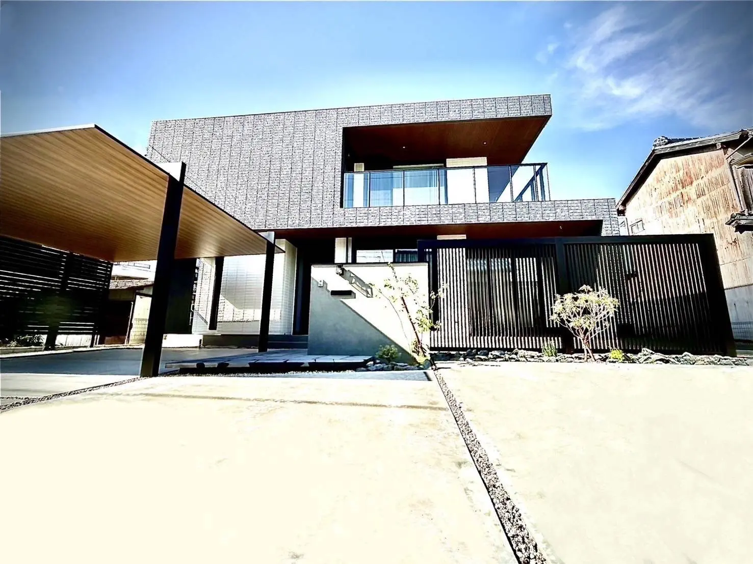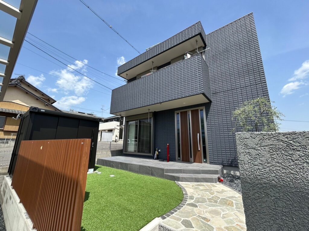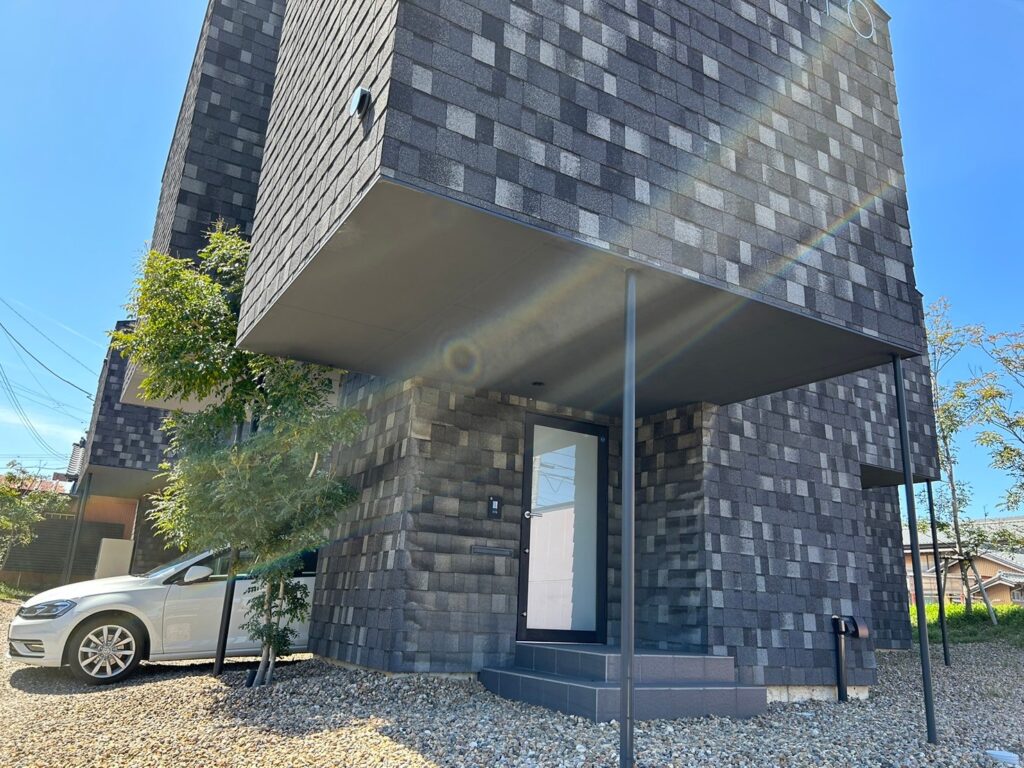 お庭と駐車場の間にはLIXILの+Gという縦格子の目隠しファサードを配置して、建物の黒色と調和をするように考えて提案しました。