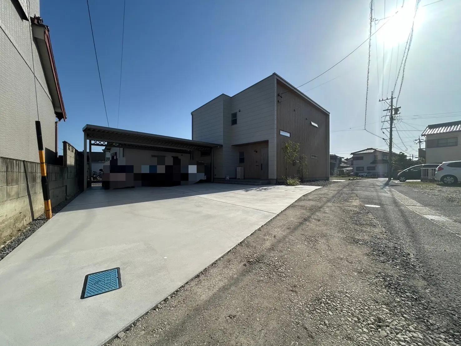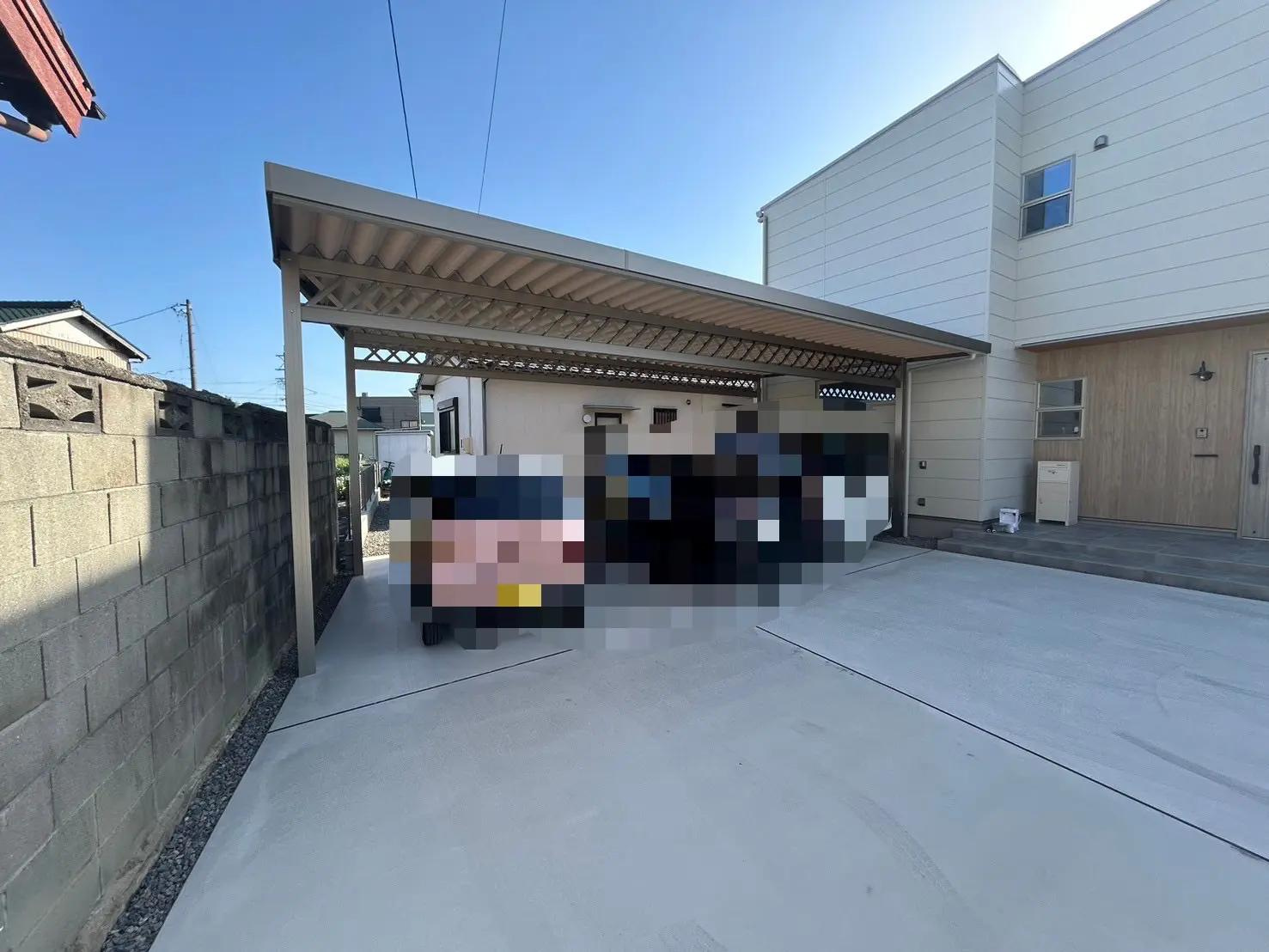 敷地内に同居するご家族の駐車スペースも確保すべく、広いコンクリートスペースには敷地形状に合わせた変形のセッパンカーポートも配して、雨に濡れにくく機能的にも便利なようになっております。