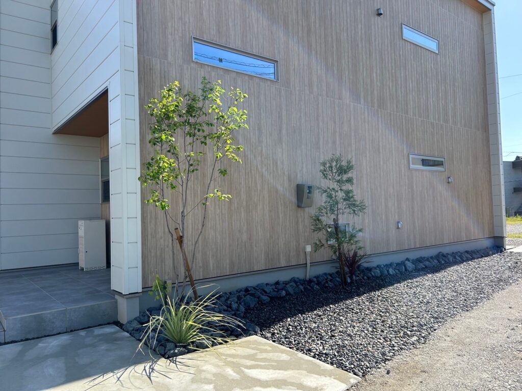 お施主様が建物のアクセント外壁の見た目を大事にされていましたので、木調の外壁前はあえてシンプルにしました。