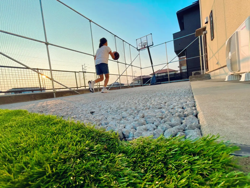 アプローチには乱形石・ピンコロ石など自然素材を用いていますが、隣接するお庭の人工芝・砕石などの異素材たちとも違和感ないよう融合してオリジナリティのある外構に仕上がりました。