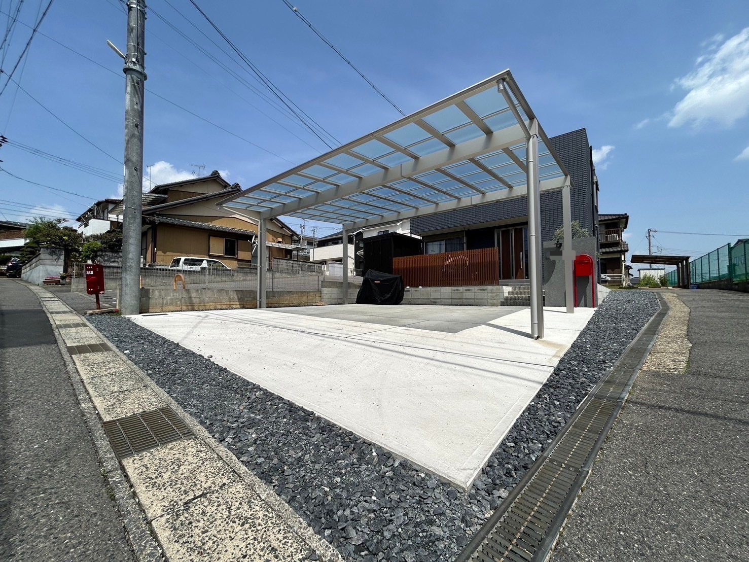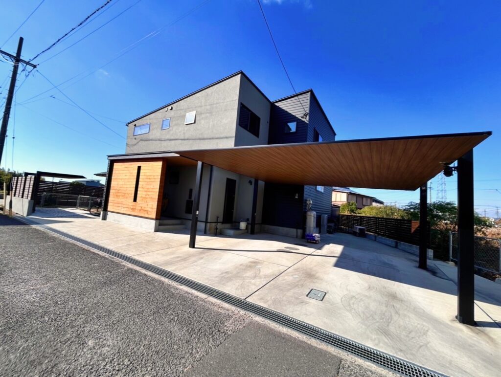 敷地内に同居するご家族の駐車スペースも確保すべく、広いコンクリートスペースには敷地形状に合わせた変形のセッパンカーポートも配して、雨に濡れにくく機能的にも便利なようになっております。
