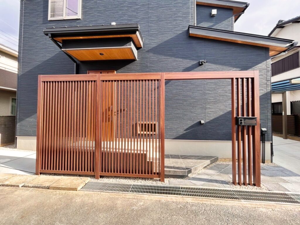 お庭と駐車場の間にはLIXILの+Gという縦格子の目隠しファサードを配置して、建物の黒色と調和をするように考えて提案しました。