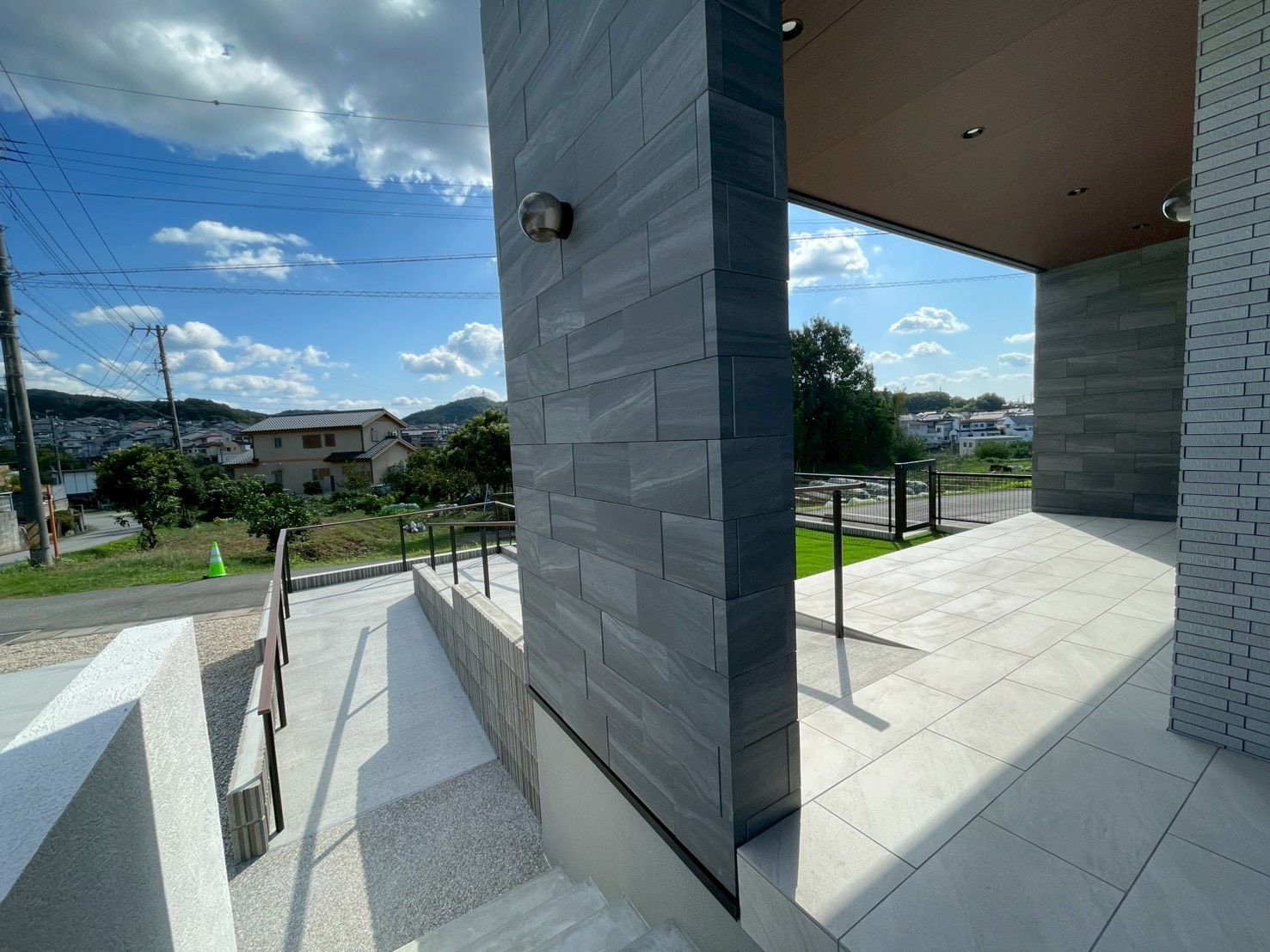車から降りて動線良く玄関まで行けるように、機能門柱は動線上に設置しながら、タイル階段も危なくない程度にクランクさせて最短距離で行ける仕様になっています。