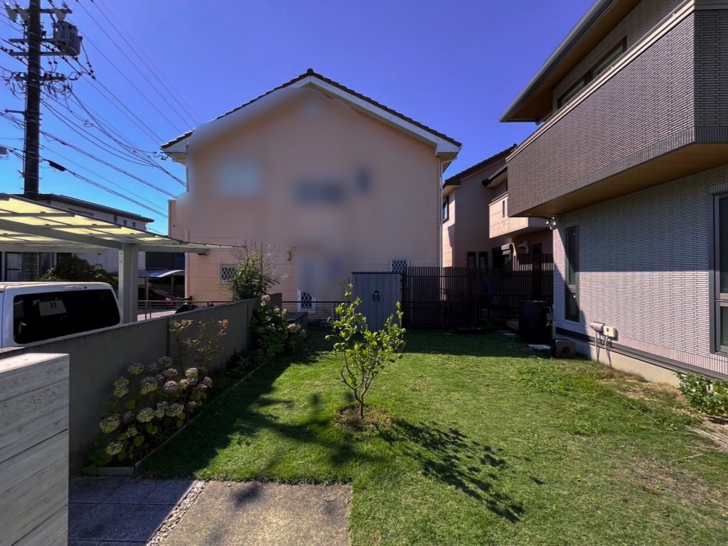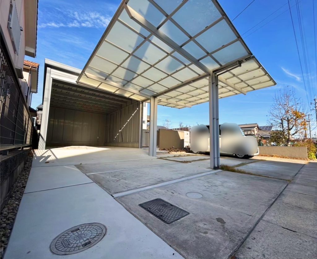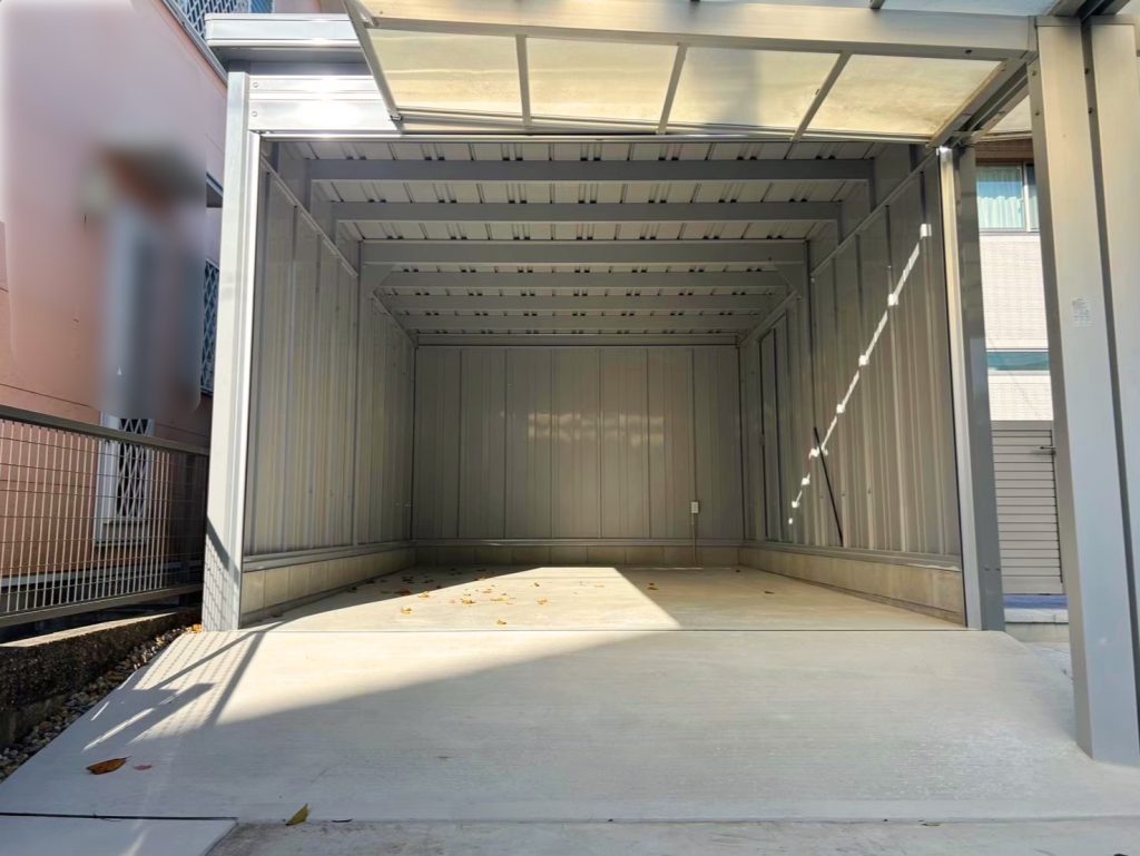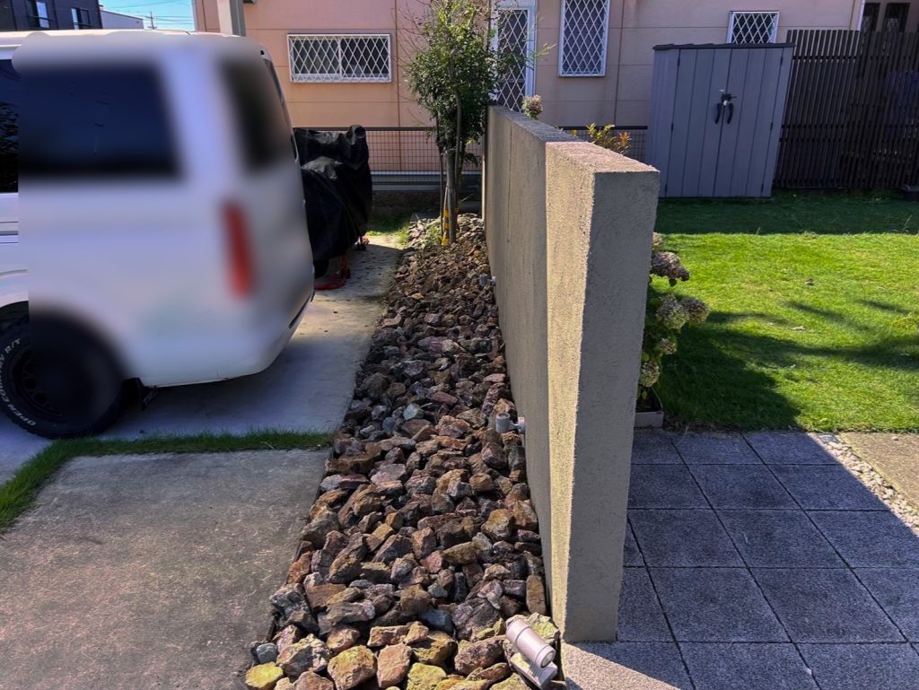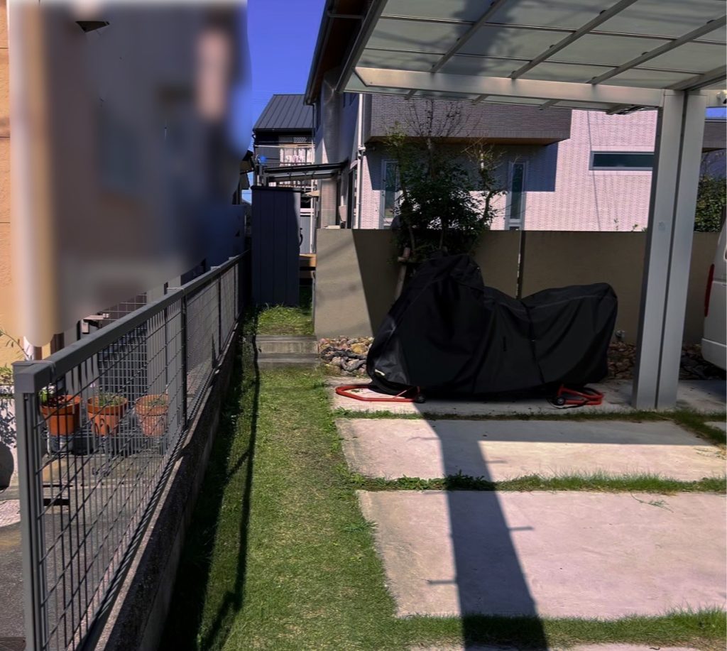既存の天然芝の一部と塀の一部も撤去してシャッターガレージを置いたので収納力抜群で雨風を遮るスペースができました。