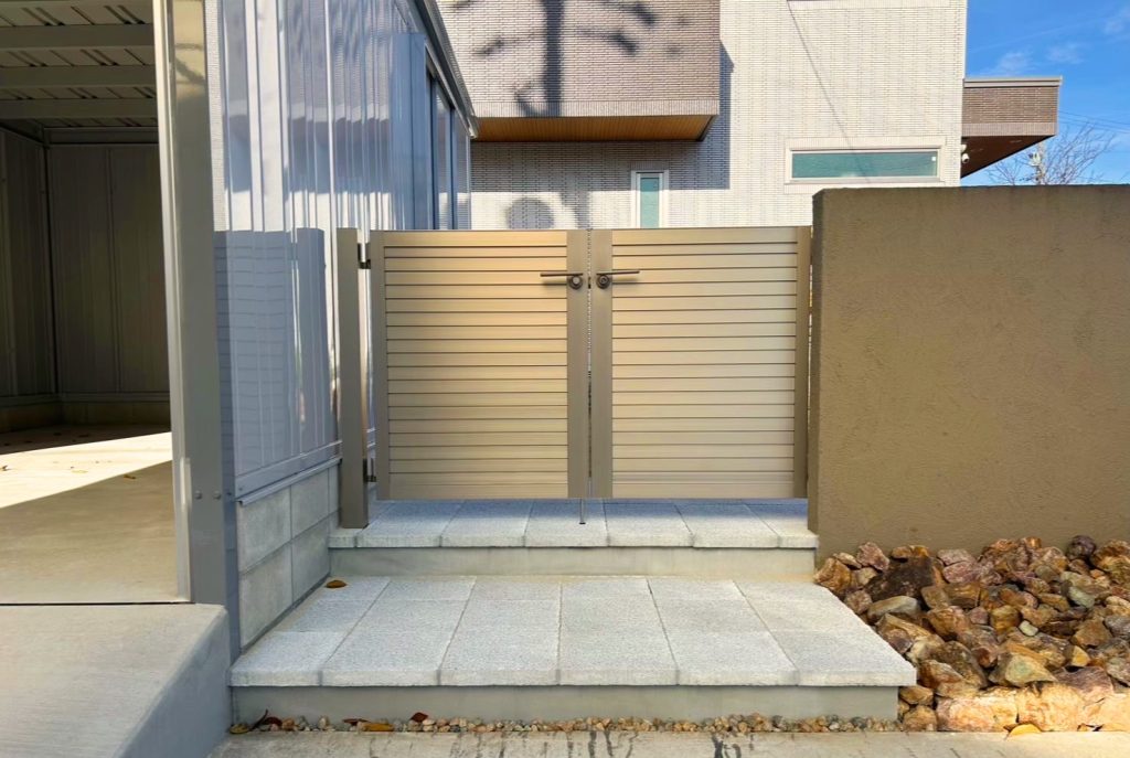 ガレージ倉庫と共に両開きの門扉と照明なども設置して、当初の外構とは仕様を変えて、完全にお庭と駐車場を仕切れるようになりました!