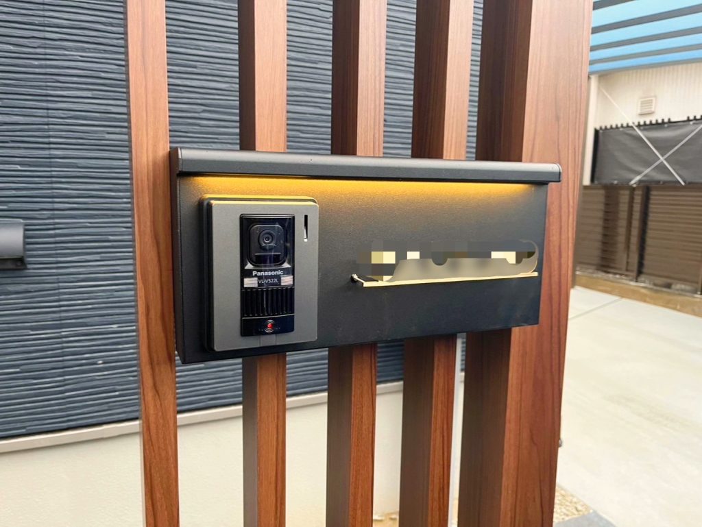 プラスGの木調色は建物の軒天と同系色で一体感があり、アーチの枠に表札・インターホンを取り付けています。