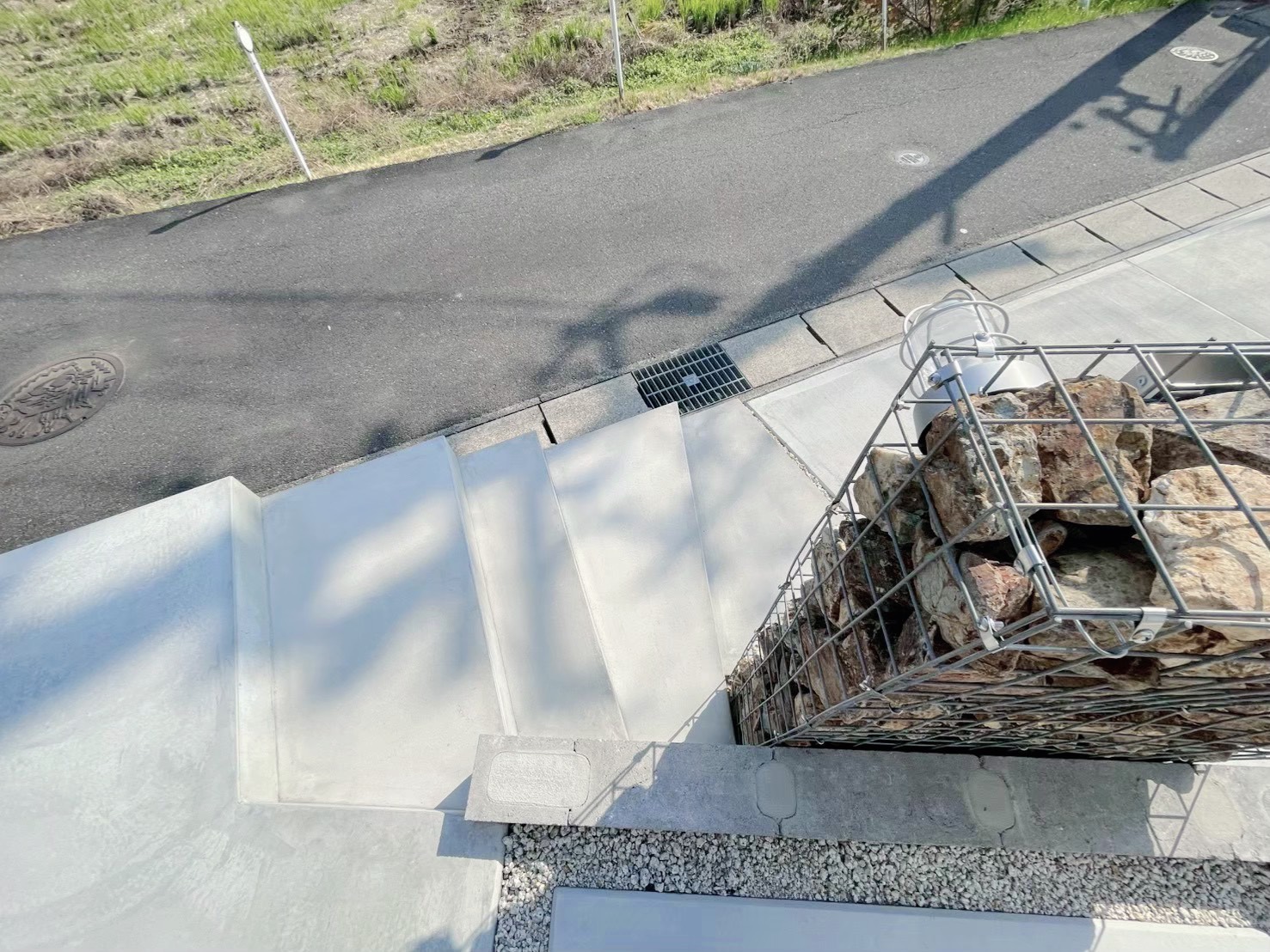 玄関扉から外に出るポーチ階段と掃き出し窓の前のステップを丸々一体的に設置して大きなモルタルデッキとなっています。