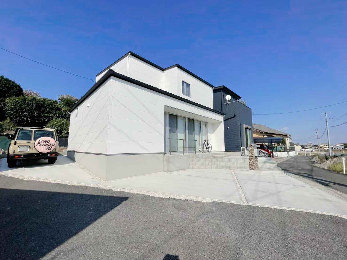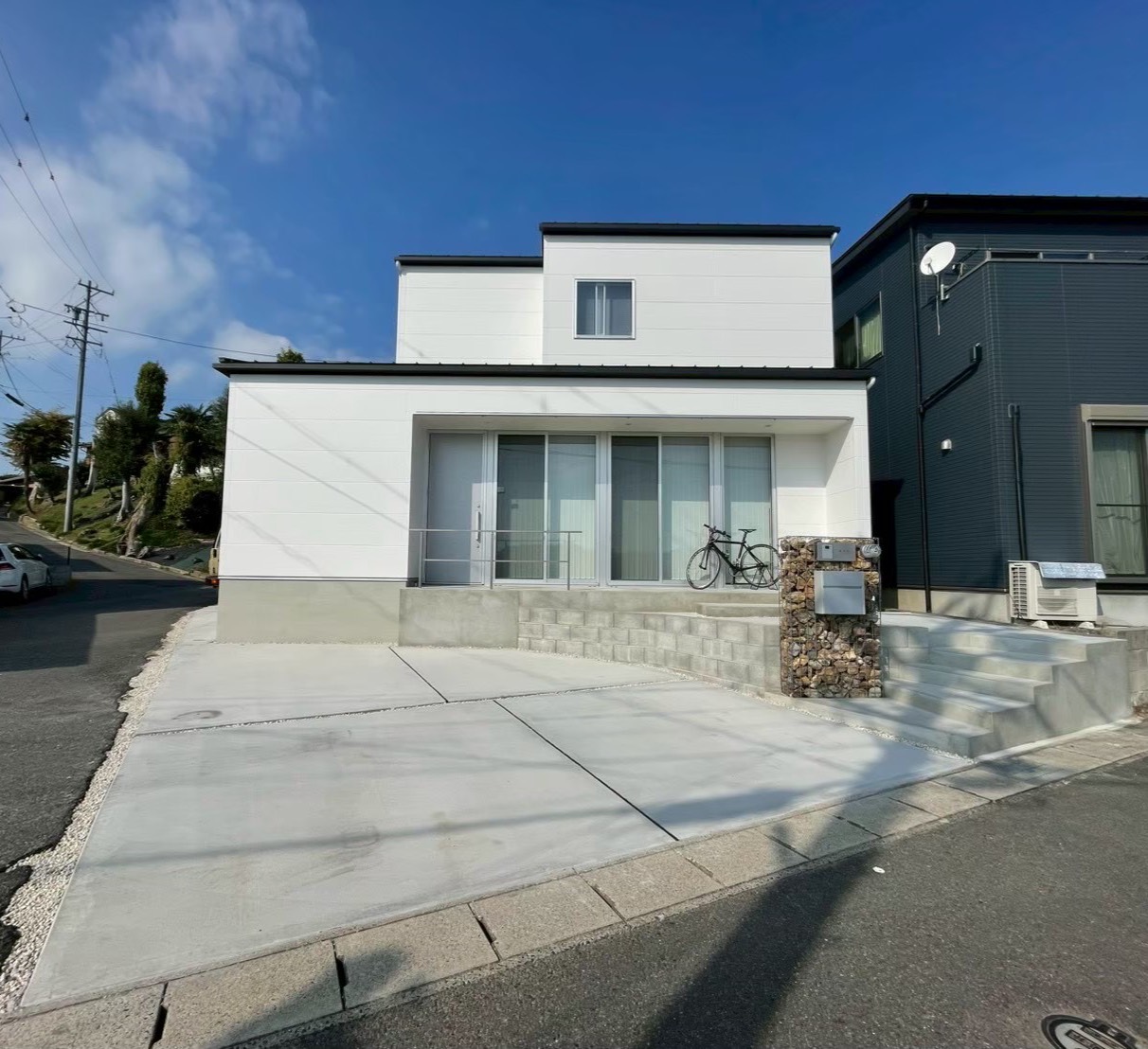 コンパクトな敷地に駐車場2台+1台と階段、ポーチ階段兼モルタルデッキをご要望としていただきました。