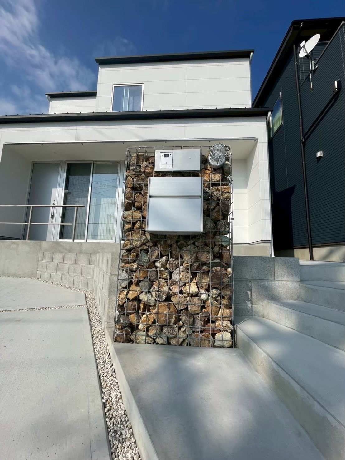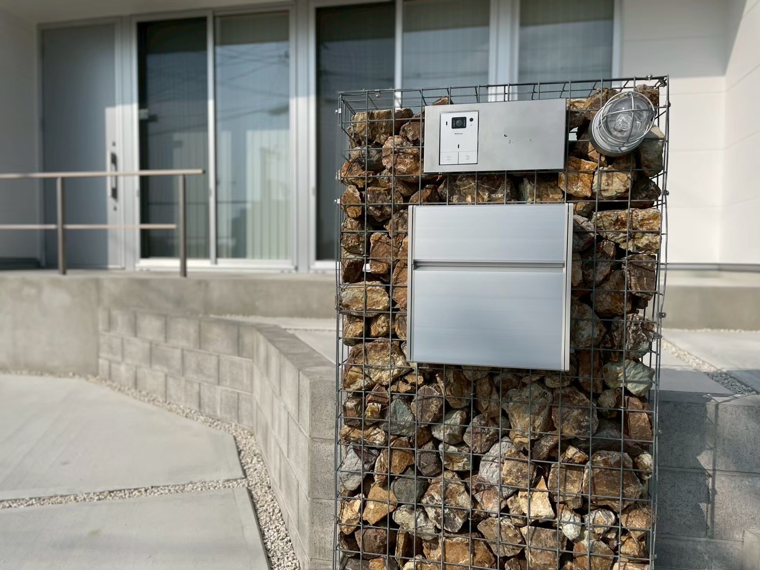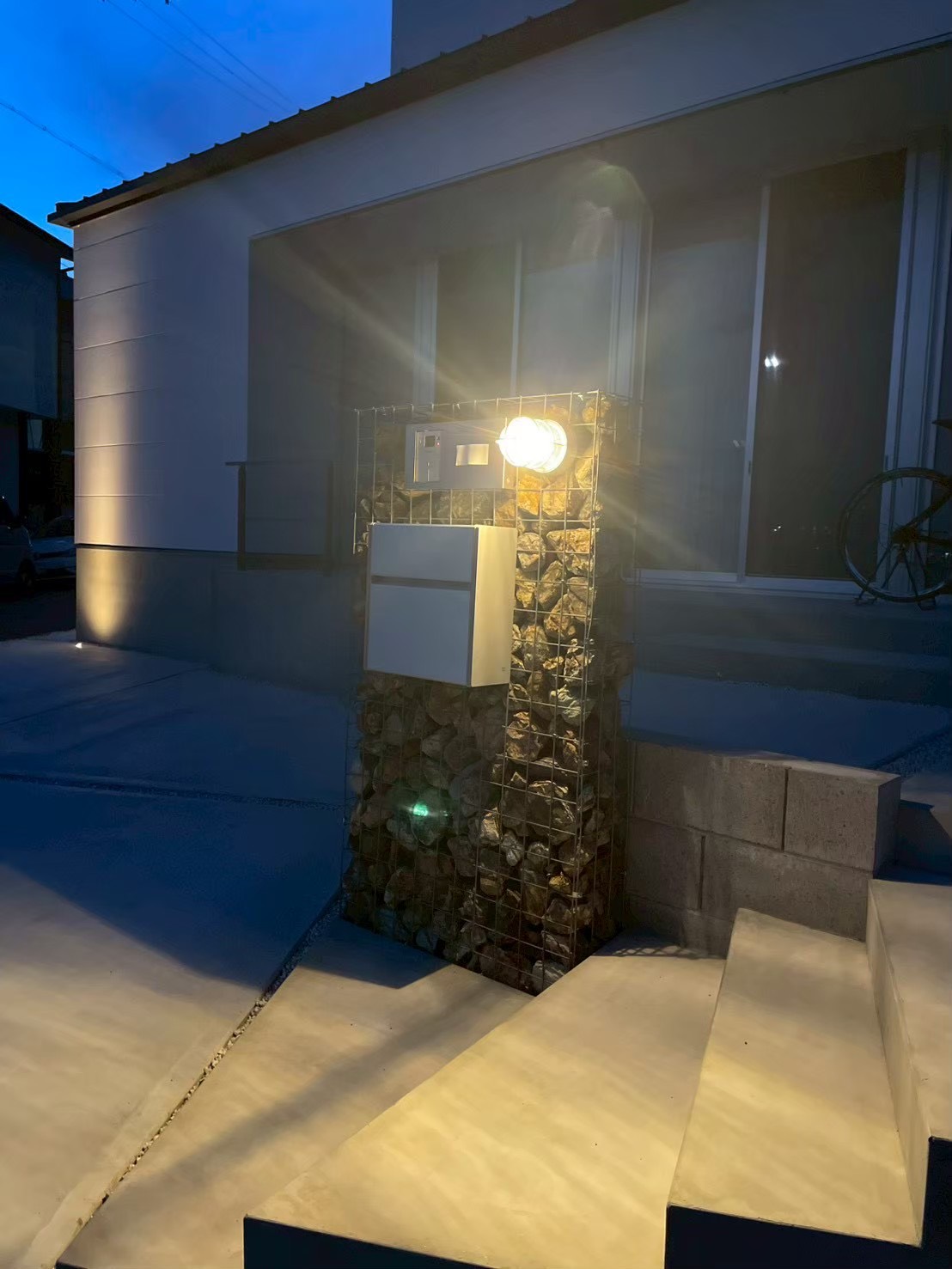 入れる石の色や風合い、ポストや表札によってもまた印象が変わってくるのがガビオンの面白いところですが、マリンライトがアメリカンな雰囲気を出してくれて良い存在となっています。