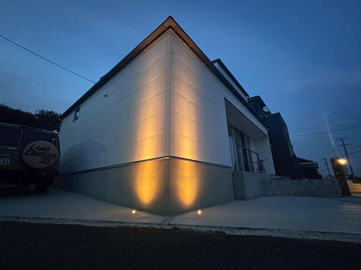 建物の角にはグランドライト照明を2つコンクリートに埋設しました。