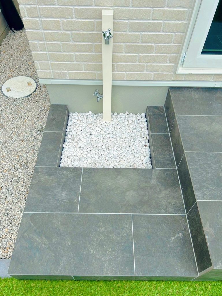 立水栓をタイルデッキのステップの一部に組み込み、そこもとても面白い形となっています✨