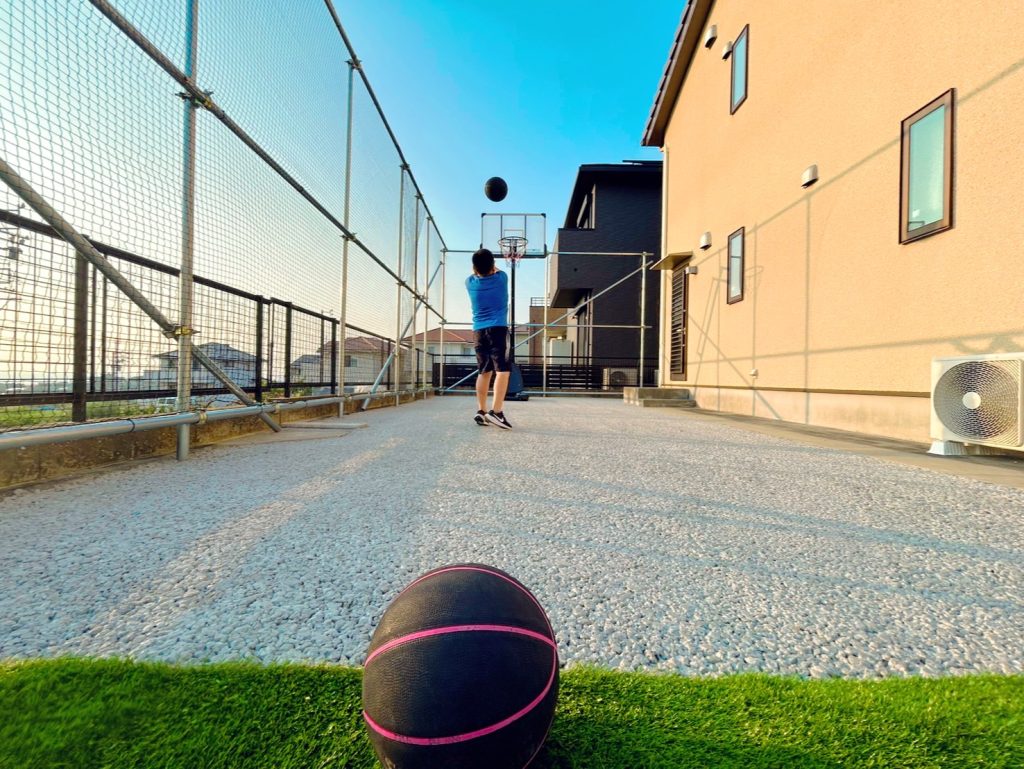 水はけが悪い場所でも心配なくフラットにできるのでバスケットボールの練習スペースに適しています。