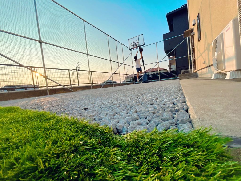 土のお庭が広く雑草に悩まされていたお宅がバスケットコートとゴルフ練習スペースに!