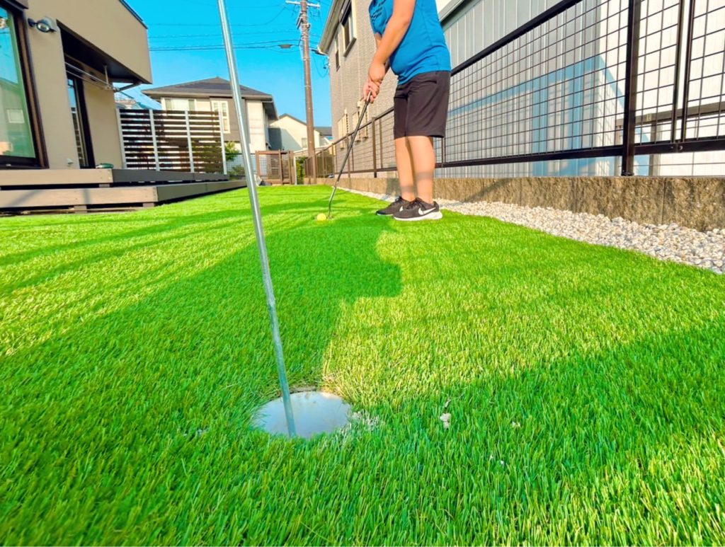 人工芝の一角にゴルフカップも設置してパター練習スペースになりました!