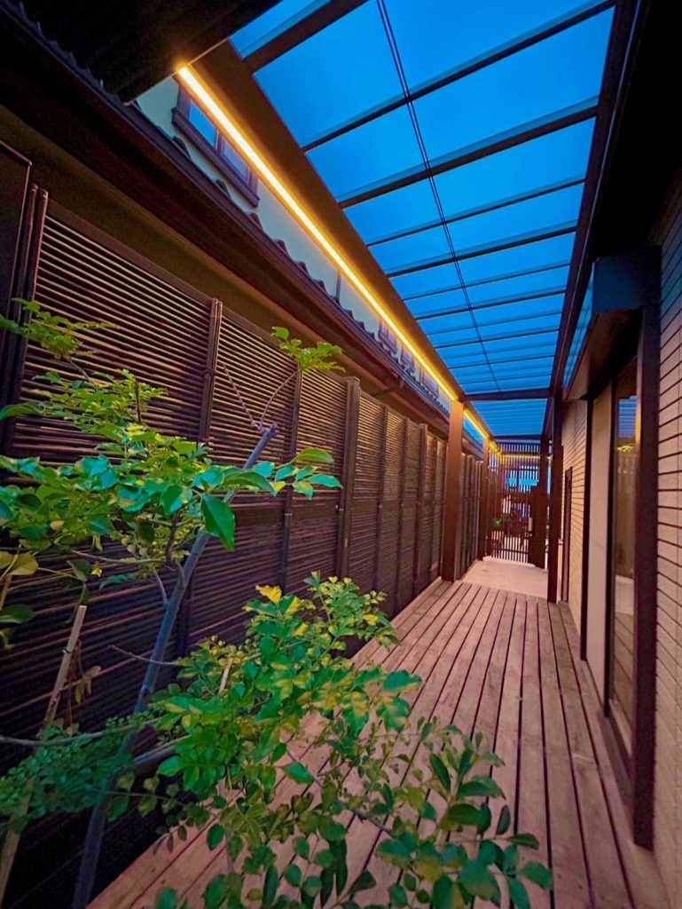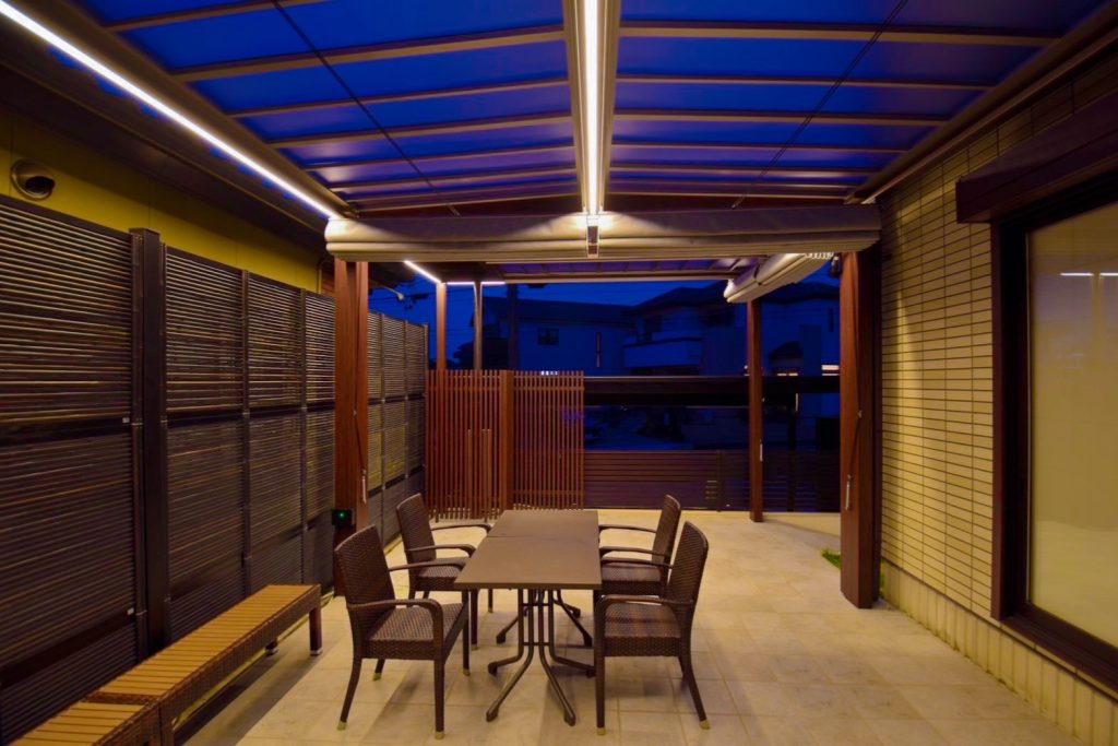 雨や夏の強い日差しを遮り、夜間はライン照明が明るく照らして、家族や友人・仲間の集う空間になりました✨