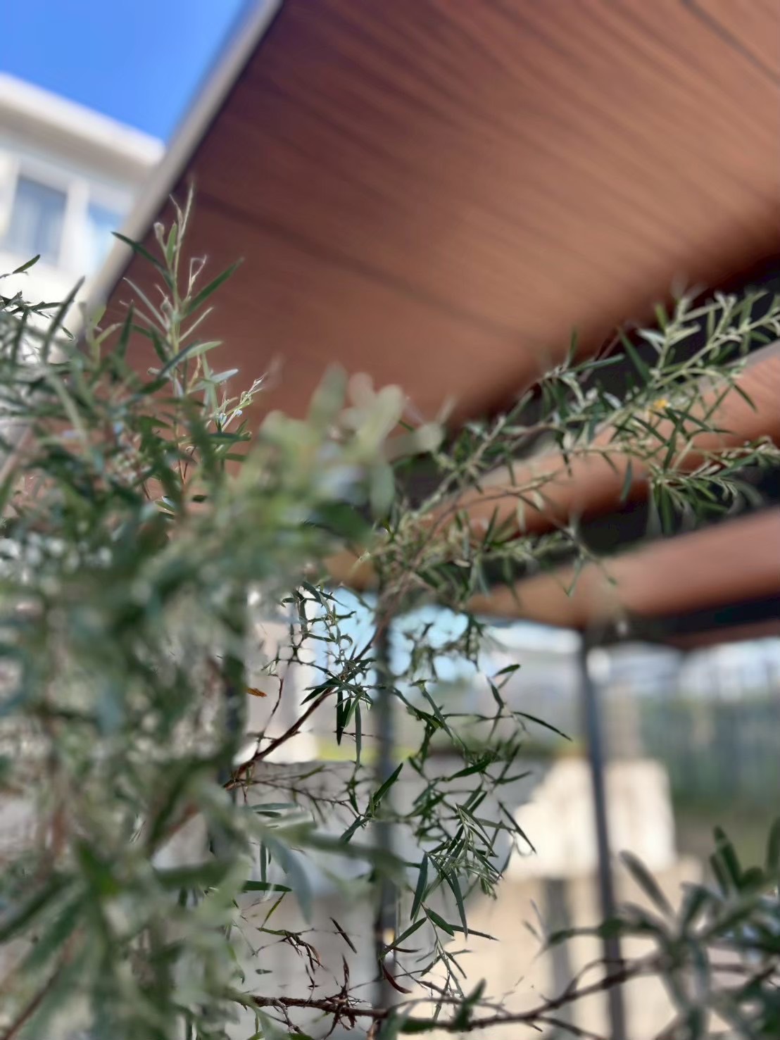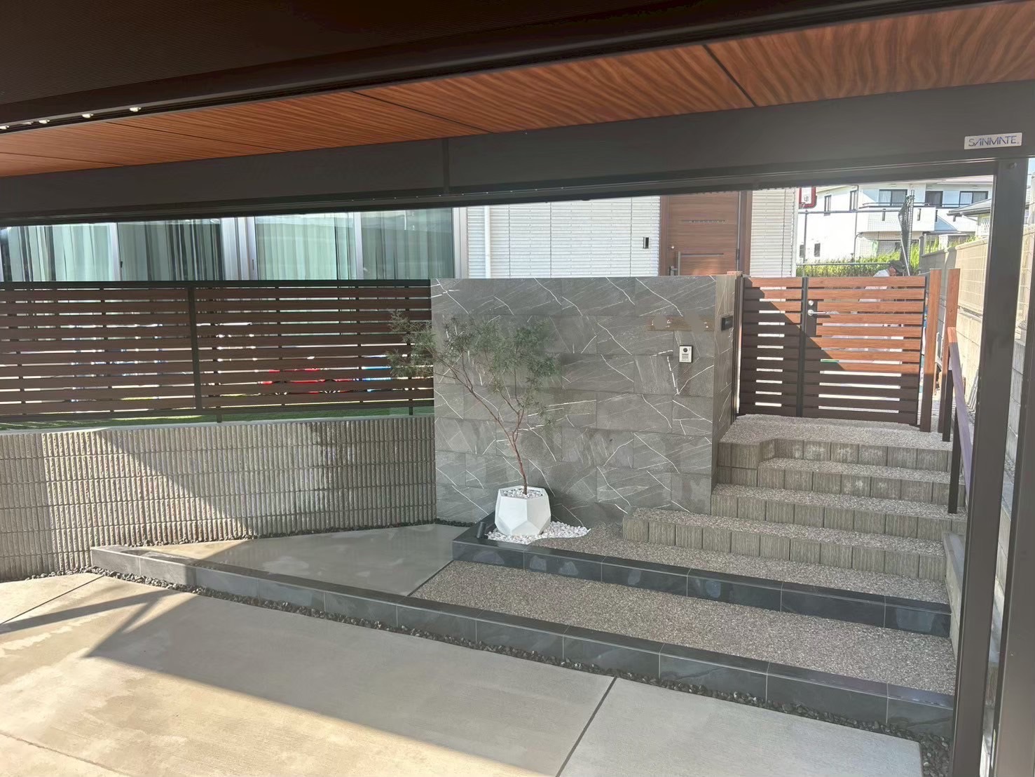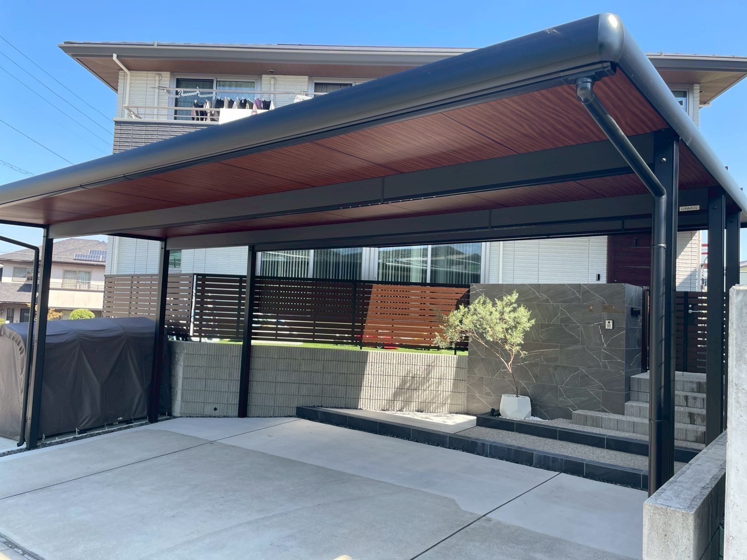 カーポートの天井に木調パネルを貼り付け施工したことが最大の特徴です。