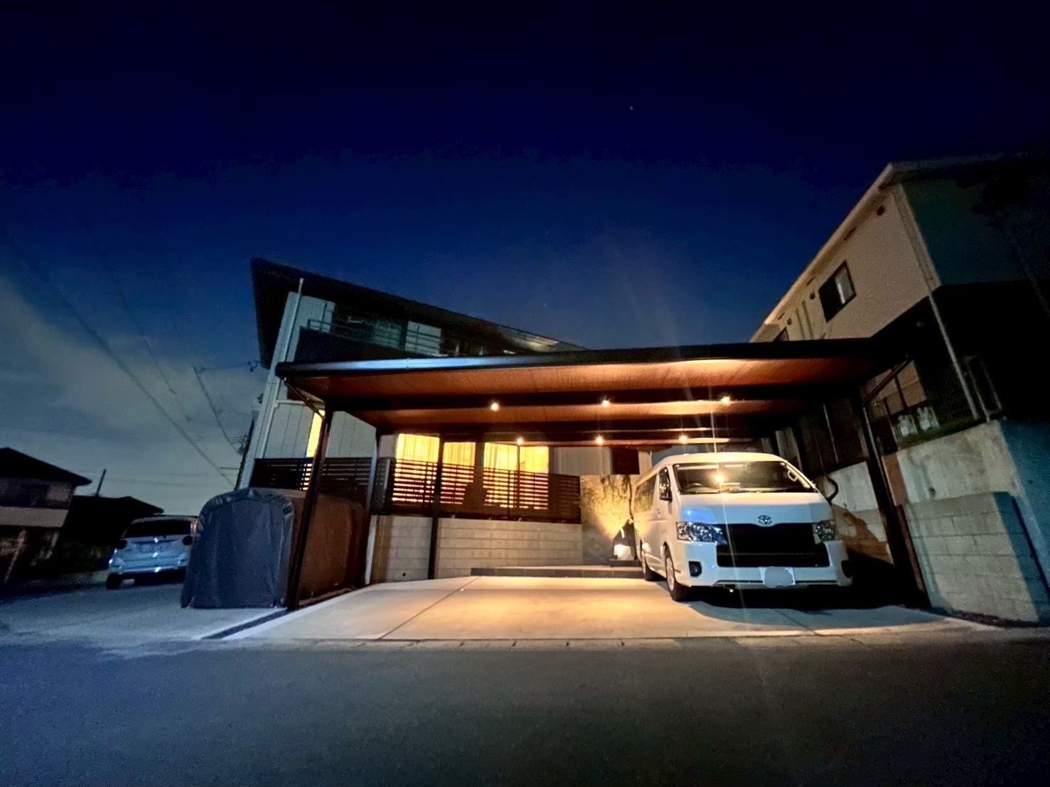 よくある折板カーポート(ガルバリウム鋼板の屋根のカーポート)をよりカッコよく見せるために天井に木調のボード材を貼り付けて、ダウンライト照明も6灯設置しました。