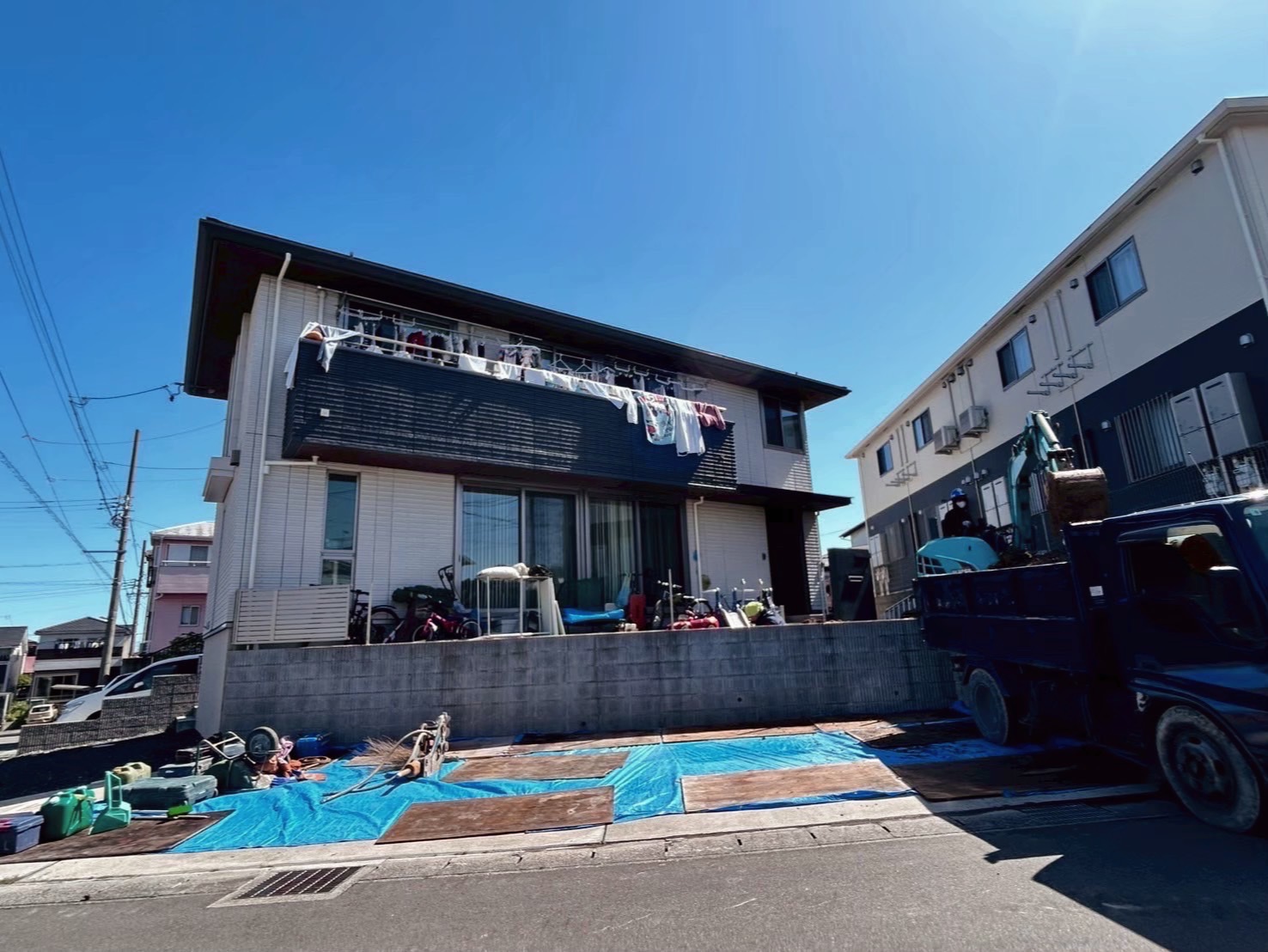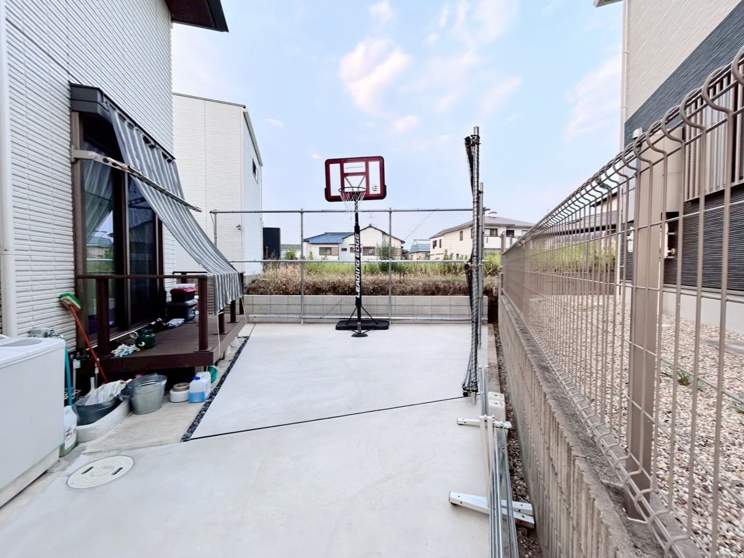 お庭にはお子さんたちがバスケットボールをする時にボールがお隣に出て行かないように単管パイプと防球ネットを高めに設置しました。