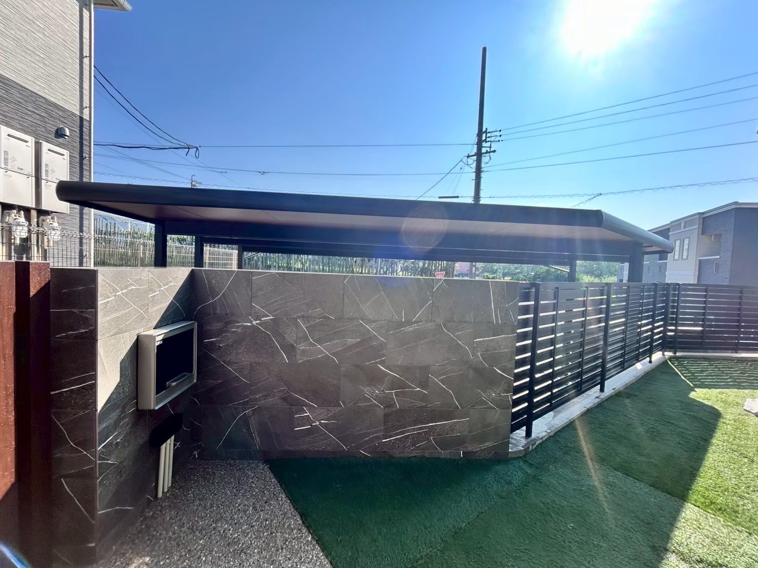 カーポートは敷地形状に合わせてフルオーダーなので、高さも幅もお客様とたくさん思案して決めました。