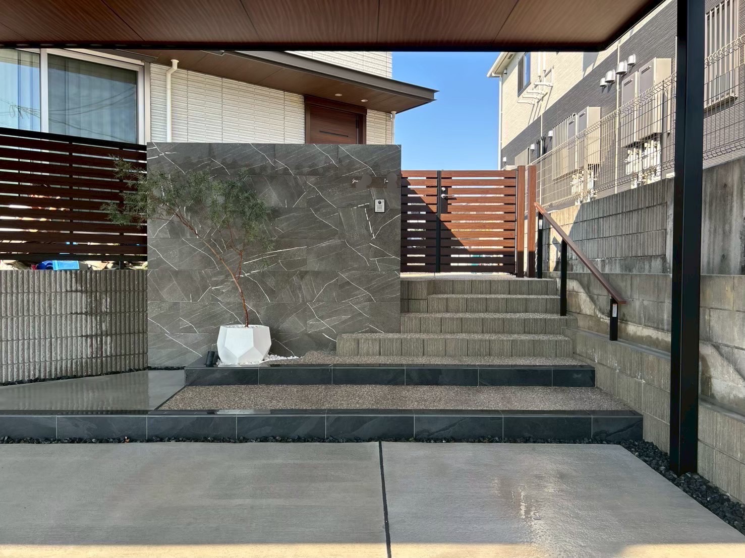 完成した外構を一緒に見ている時にお客様からは”相談する前に自分たちで描いてた形とは全然違うものが出来上がって、まさかこんな風になるとは家族の誰も想像もできていなかったです!”とのお言葉もいただきました。