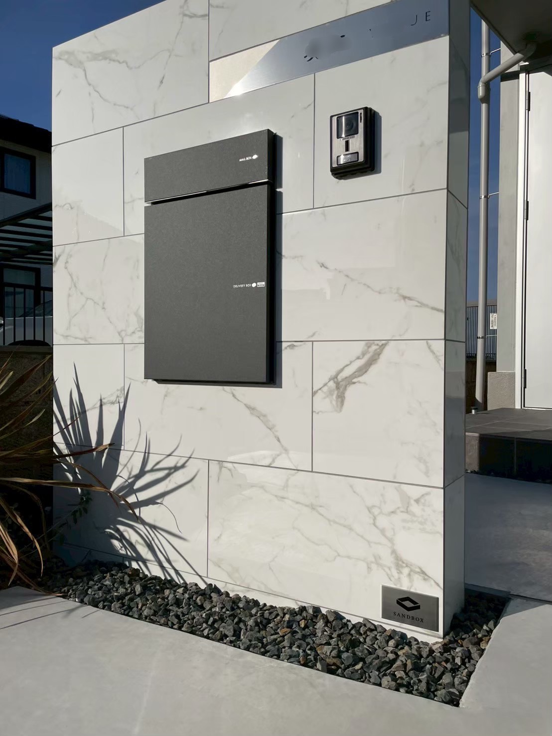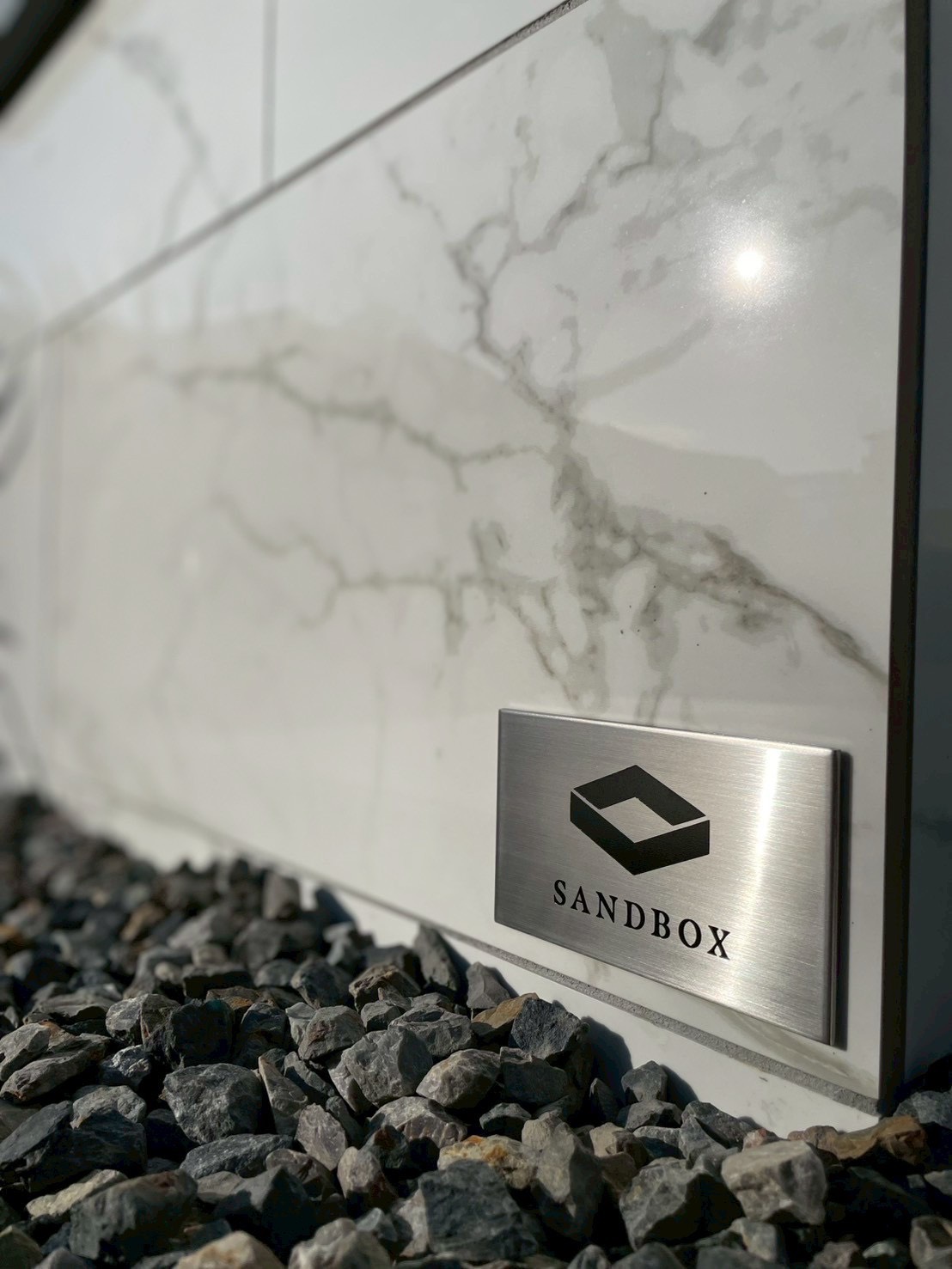 ステンレスの光沢感と黒塗装のSANDBOXの文字やロゴが入ったプレートが門柱の右下に付いています。