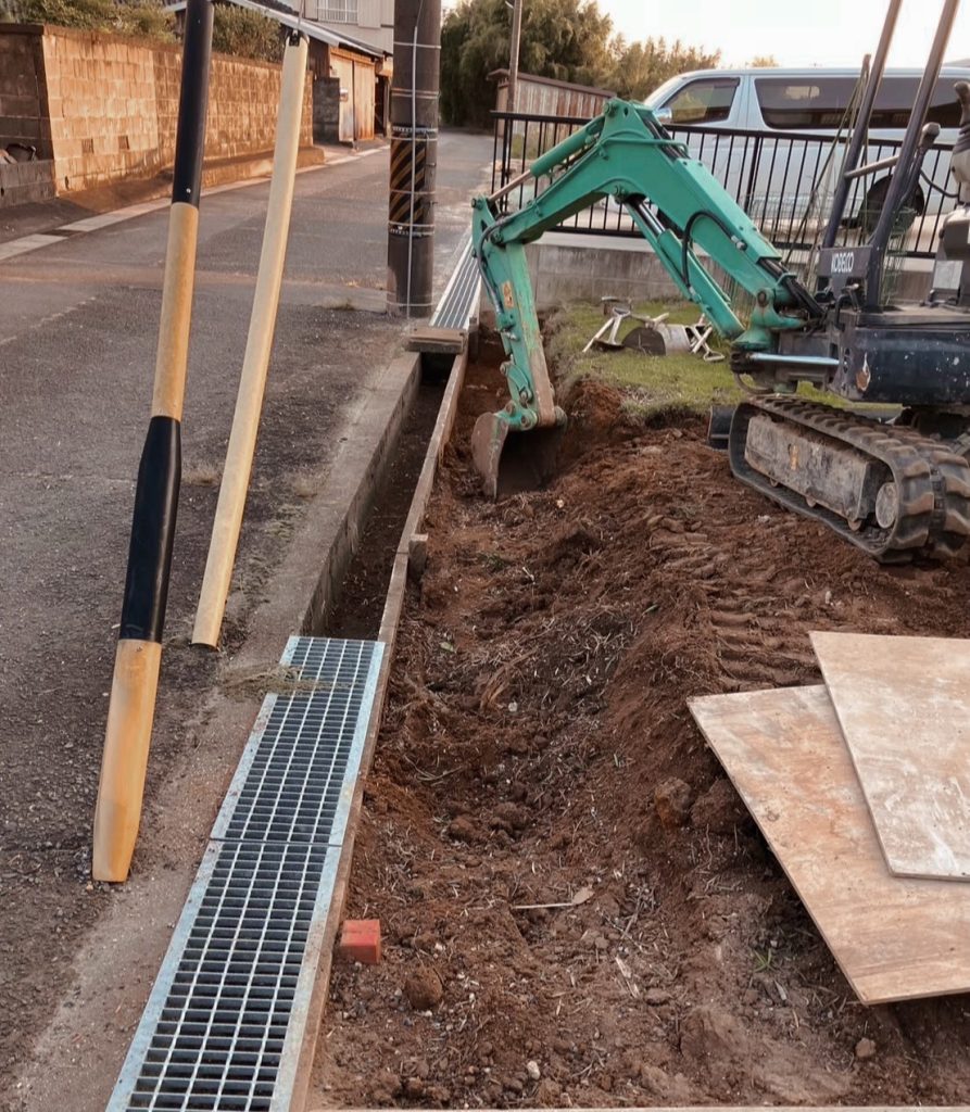 その下にはお庭の土を留める目的+建物の雰囲気にマッチさせる目的で、建物外壁の塗りと一緒の塗り壁を採用しました。