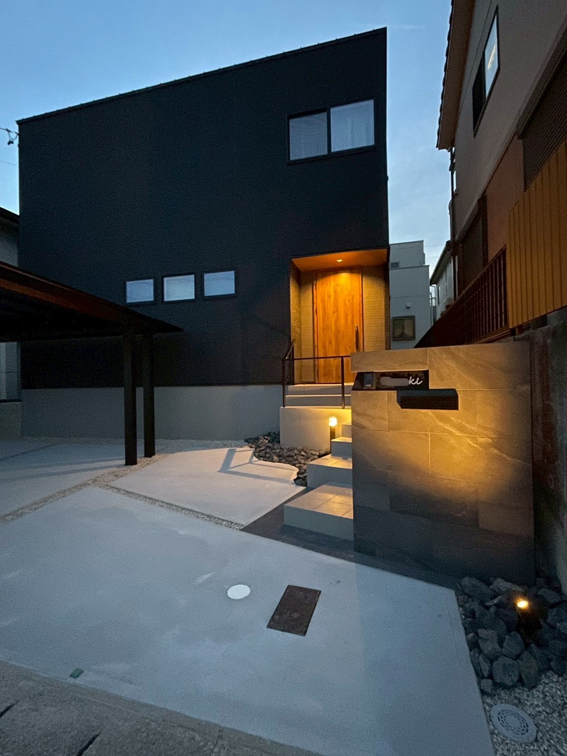 🏠愛知県知多郡東浦町 🍃…………………………………………🍃 東浦町の閑静な住宅街に黒のスタイリッシュなご新居を建てられたお客様。 親御様の外構を施工したご縁から娘様ご夫婦をご紹介いただき、今回ご担当させていただきました! 駐車場から建物へなるべく雨に当たら...