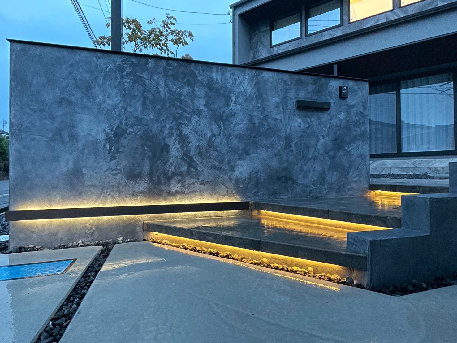 🏠愛知県大府市 🍃…………………………………………🍃 少し高低差があるお宅の新築外構工事をご依頼いただきました。 階段をせっかく作るなら他のお宅にはない形状でかっこいいものにしようとなり、蹴込みの階段にして、そこにライン照明も設置しました。 タイルはお客様...